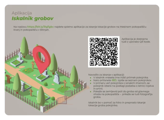 Obiskovalce Mestnega pokopališča Kranj in Pokopališča Bitnje prijazno spominjamo, da si lahko pri iskanju grobov pomagamo s spletno aplikacijo – Iskalnik grobov. S pomočjo aplikacije si lahko iskanje poenostavimo in hitreje najdemo grob, ki ga iščemo.