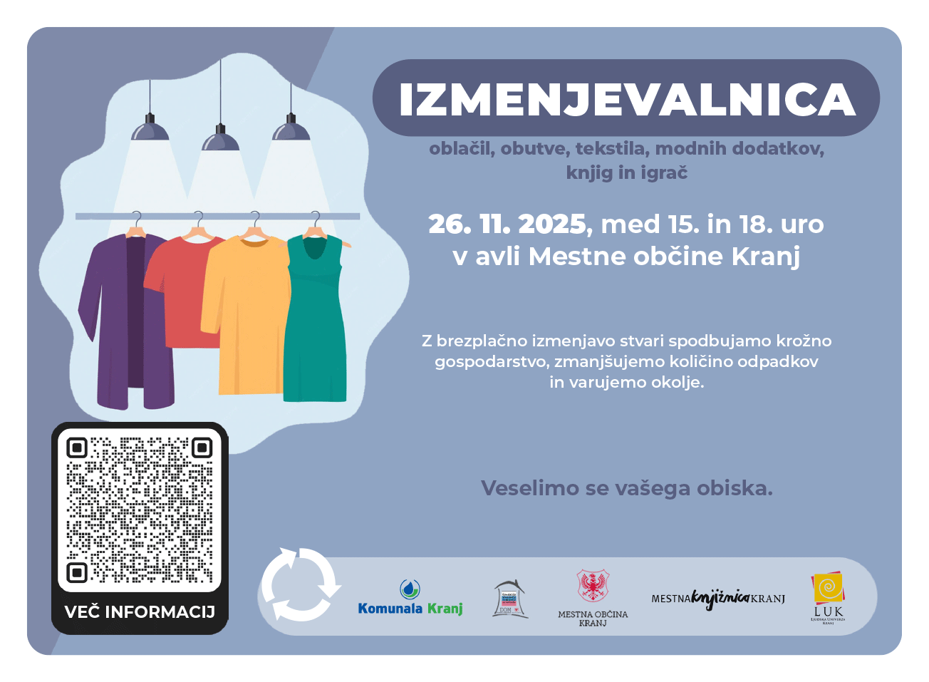 Stvari lahko do 24. novembra 2025 v času uradnih ur oddate na blagajni Komunale Kranj ali v šiviljski popravljalnici Kr’Zašij, lahko pa jih prinesete kar na dan Izmenjevalnice, ki jo boste obiskali.