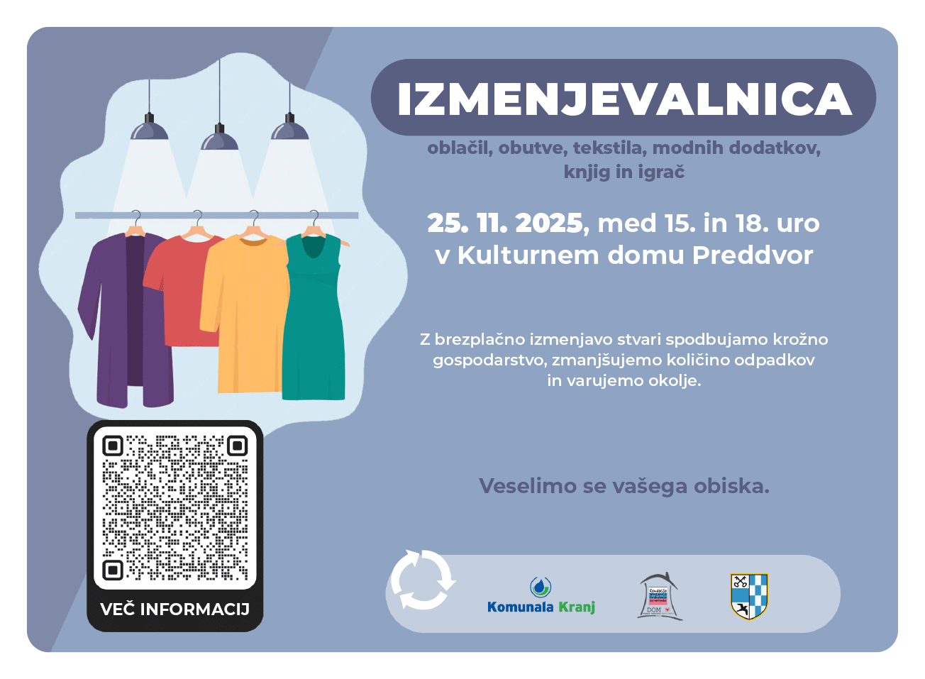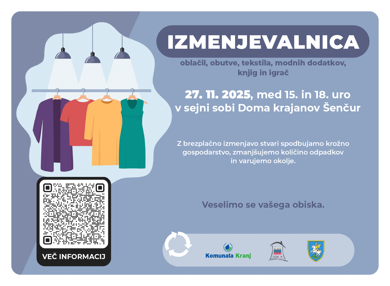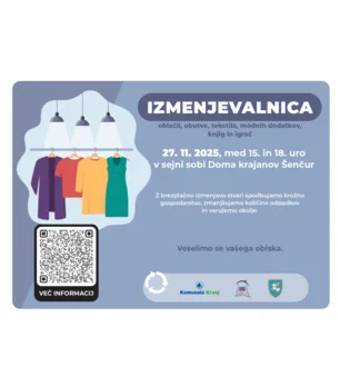 V okviru Evropskega tedna zmanjševanja odpadkov (ETZO), ki že od leta 2009 povezuje evropske akterje pri spodbujanju zmanjševanja, ponovne uporabe in recikliranja odpadkov, Komunala Kranj skupaj s Fundacijo Vincenca Drakslerja in partnerji Mestno občino Kranj, Občino Šenčur, Občino Preddvor, Mestno knjižnico Kranj in Ljudsko univerzo Kranj organizira Izmenjevalnice stvari v Preddvoru, Kranju in Šenčurju. Prinesite, odnesite ali izmenjajte oblačila, obutev, modne dodatke, knjige in igrače.