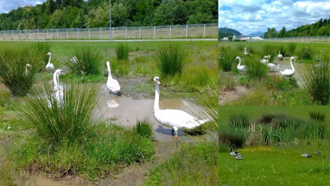 Mokrotni habitat na območju Centralne čistilne naprave Kranj po močnejšem deževju privablja vodne ptice (labodi, race, čaplje).