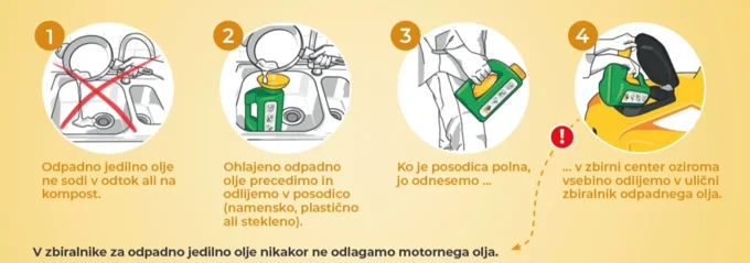 Olje po kuhanju, ko se ohladi, odlijemo v namensko posodo ali precedimo skozi robček ali cedilo v plastično ali stekleno embalažo (kozarec za vlaganje, steklenica,…). To začasno hranimo v kleti, garaži in ko se nabere več odpadnega jedilnega olja, ga lahko brezplačno oddamo: